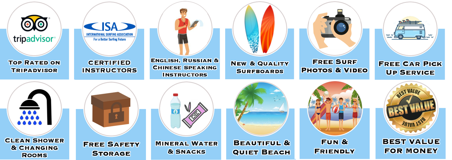 我们的冲浪课程包括:~ 免费冲浪视频与照片 ~ 免费酒店接送服务 ~ 矿泉水与小吃 ~ 储存设施 ~ 冲凉更衣室和厕所 ~ 免费使用冲浪设备及配件(冲浪板,安全带,蜡,防晒衣,游泳裤等)。